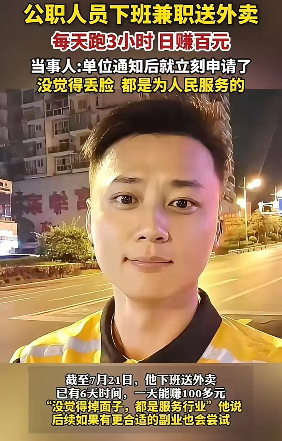 最近,四川遂宁的一位公职人员孙先生分享了他利用业余时间送外卖的经历,引发热议。单位允许公职人员从事合规副业的新规出台后,他主动报批,利用晚上8点后的时间兼职,每天大约三小时,能赚一百多元,还说:“都是服务行业,没觉得掉面子。”